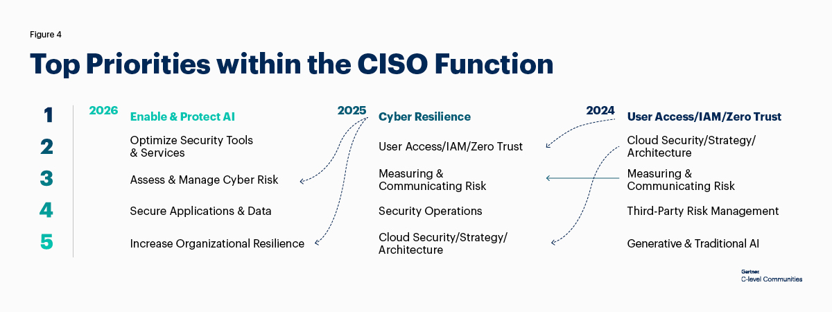 Based on 1,300+ CISO responses to Gartner C-level Communities’ proprietary Leadership Perspective Survey, March 2026.